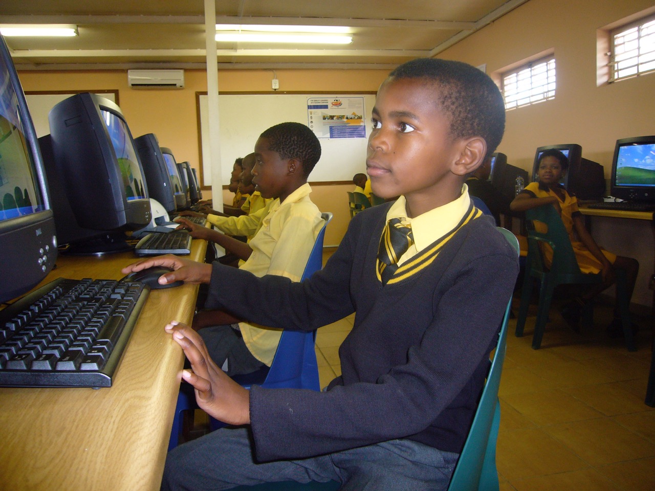 When Aid Africa’s Children first visited Sjambok School in Erasmus, South Africa, the staff and students proudly showed them their “computer lab.” At the time, their “computer lab” consisted of an empty room with a few counters. There were no computers in sight. Their strong vision and belief that someday they would have a computer lab was impressive. Beginning in Fall, 2007, Aid Africa’s Children set to work on making this dream become a reality. In Spring, 2009, 50 computers arrived to the school with software, installation and transportation, generously donated by Baxter, the global healthcare company.