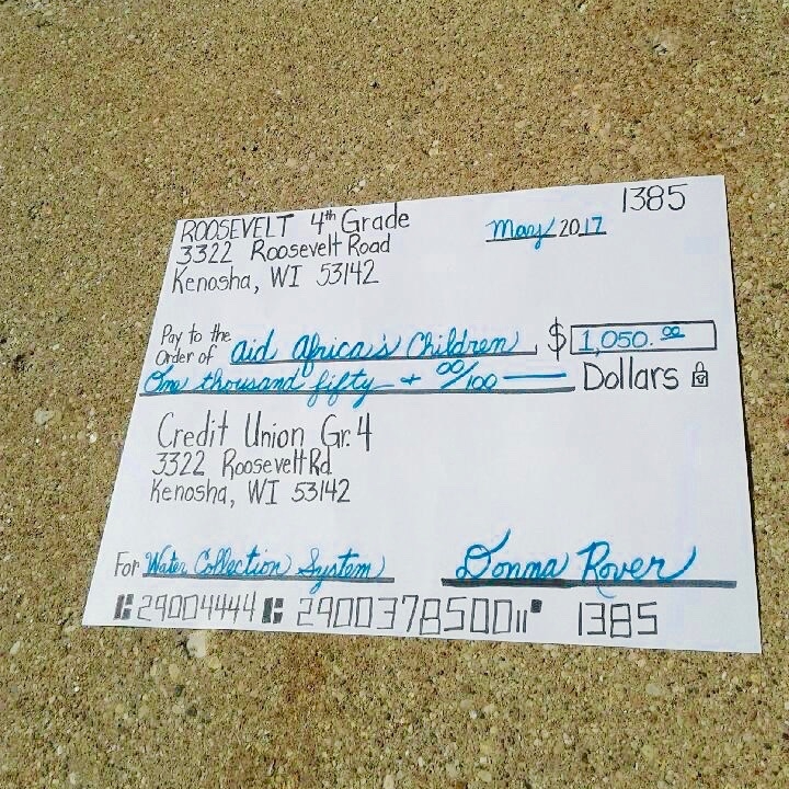 Roosevelt Elementary School's 4th grade students of Kenosha, Wisconsin raised $1,050 for Aid Africa’s Children’s project to bring clean water to Africa.