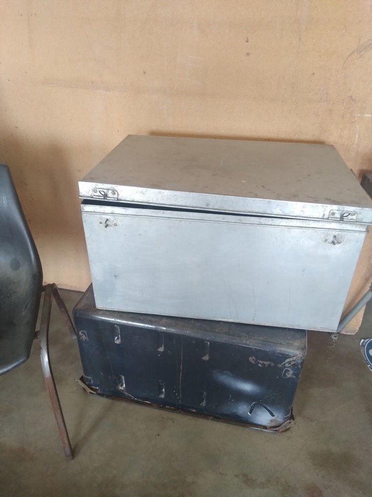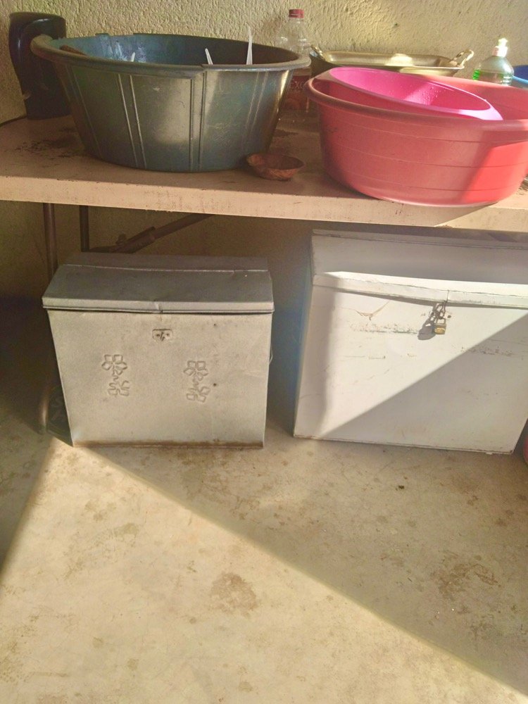 Sophie bought the bins because they were cheaper than plastic containers. It’s not apparent, but metal bins leak because the corners of the bin and lid never quite seal the metal pieces together. For “extra care” Sophie would put plastic over the bins with bricks. Often, she put the bins on bricks or another container to keep them off the floors in case they flooded.