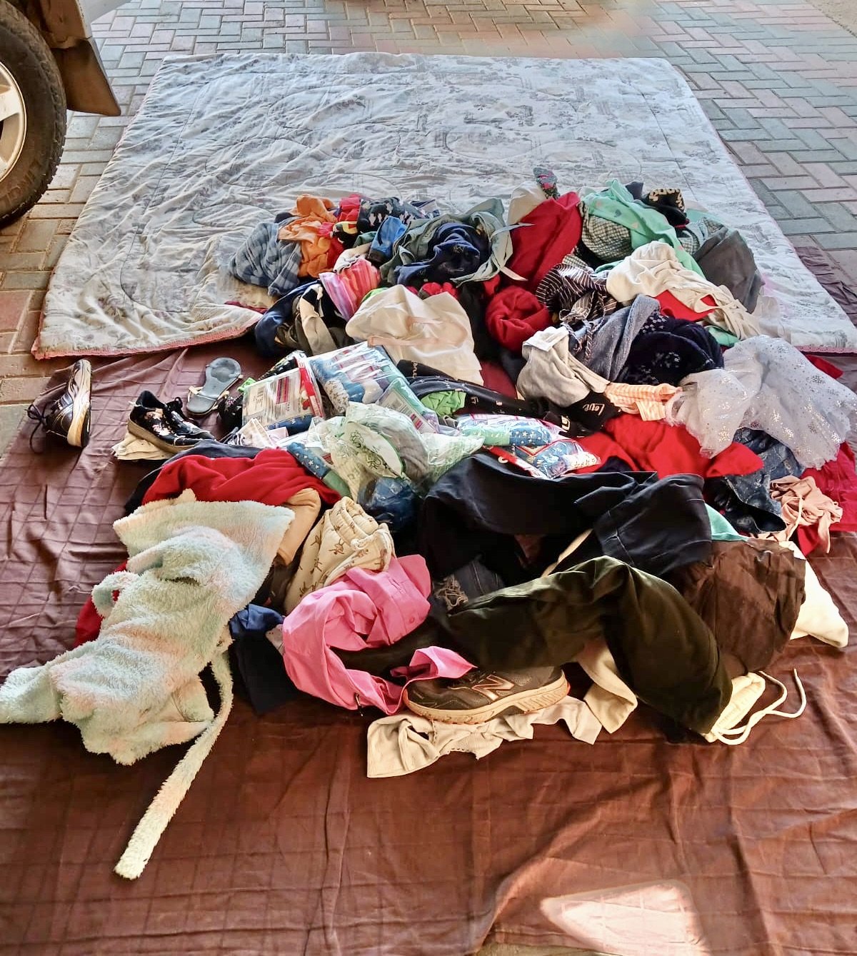 The clothes are emptied on the blanket before being distributed with toiletries for the Soul Sparkles Parcels. Then items are placed in small portions for the kids with their names.