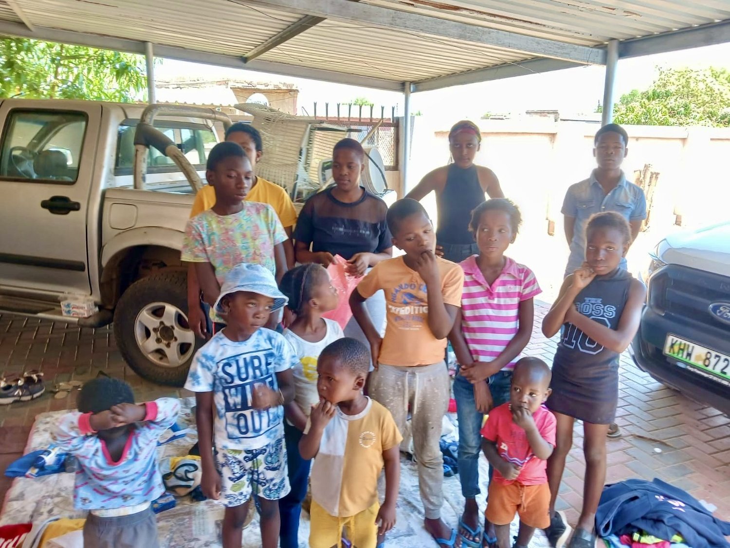 Sophie’s trip to America brought many gifts. The clothes being distributed are from Aid Africa’s Children’s clothes drive for the Soul Sparkles (AIDS orphans) and Sophie’s Creche. The Soul Sparkles gather to pick up their Soul Sparkle Parcels, a “care package” of clothing and toiletries placed on and around the blanket. Normally, they only receive toiletries so the clothes are a special treat.