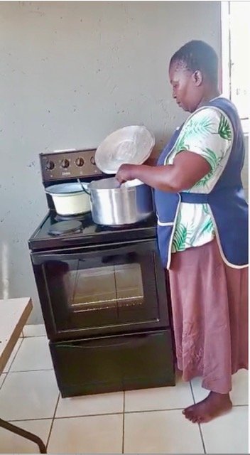 She is cooking macaroni and tomato sauce. She is cooking two things all at once which makes things easier. And, she is cooking and cleaning the office in between. Because of this big stove she doesn’t have to wait around, to make sure the pot cooks. Remember, the 2 plate stove, was really slow, sometimes the children were picked up by the school transport, and went home hungry. This is handy. This is very handy.