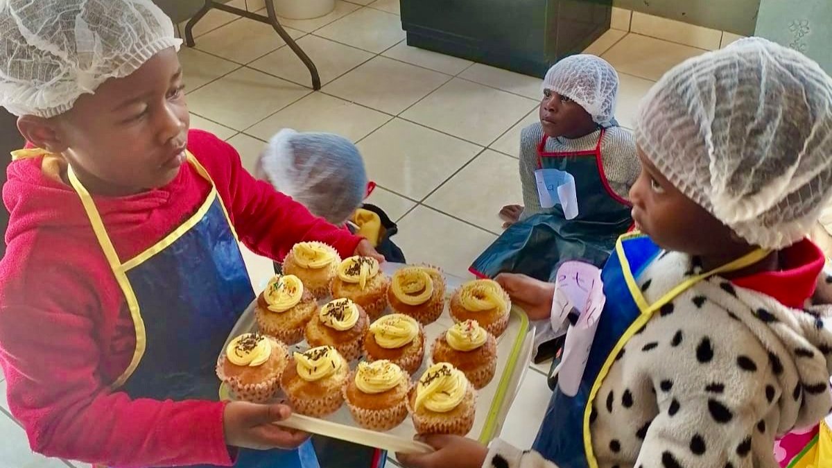 Kids from Sophie’s Creche prepare to share their first attempt at making muffins with the other students.