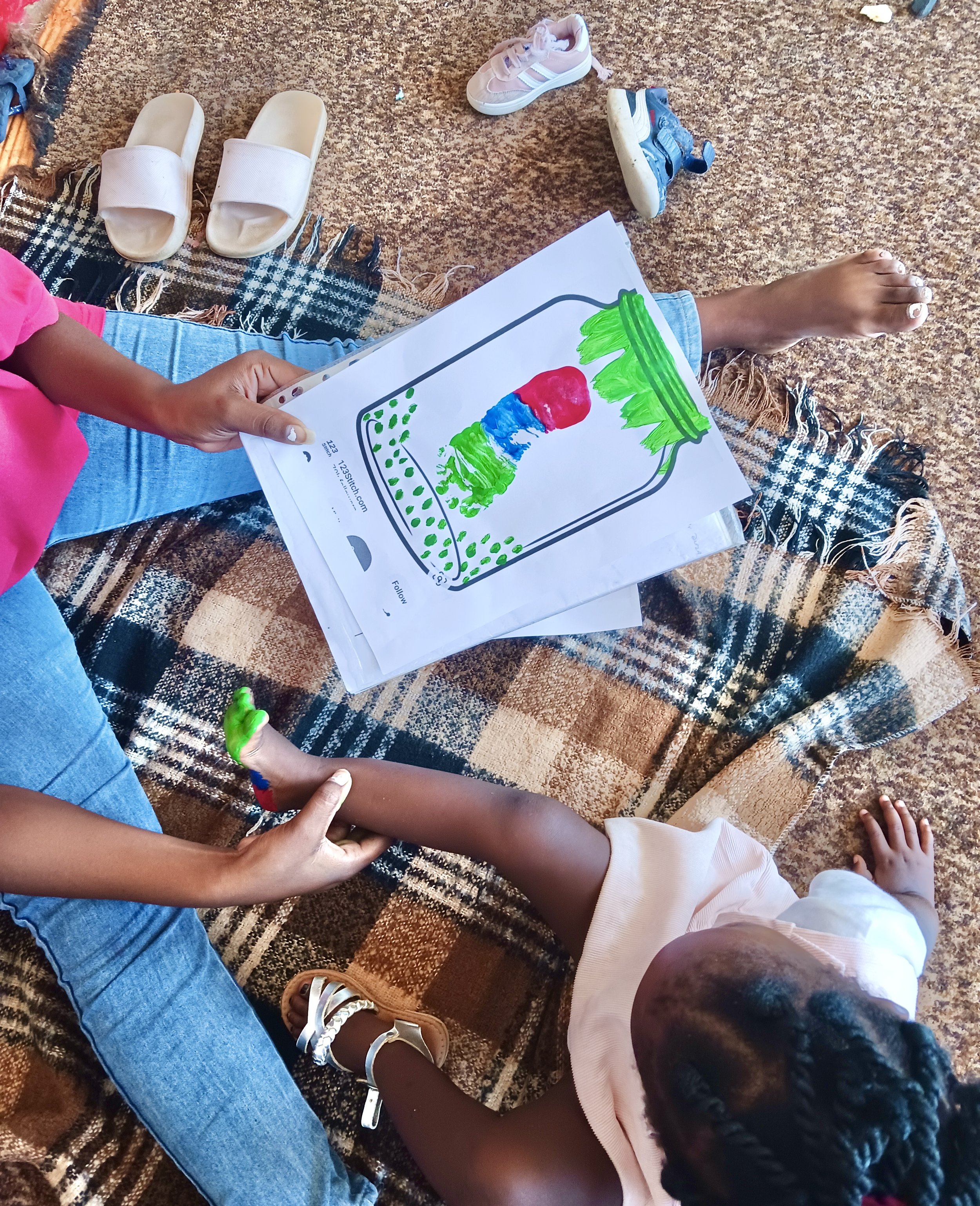 Nosipho displays the final work of art, and holds the tiny foot of the student who created it!
