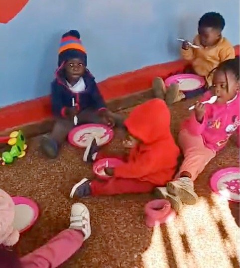 Hello LuAnn, this is how the children are eating. This is their morning porridge, and they are sitting on the floor. Instead of sitting on tables and chairs, because we don’t have tables and chairs. This is the kind of bowl that they are suppose to have their soft porridge in but they only have 4 left. They are not suppose to be eating in these one, because these are flat and the porridge is soft, so we have to leave the porridge to cool down, so it doesn’t burn them. So we don’t have chairs in here, we only have one table. And we have one table for the teachers where they are sitting.