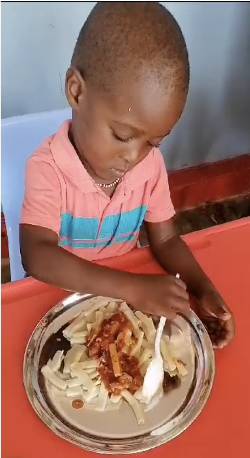 Toddlers at Sophie’s Creche enjoy their first meal on new plates that meet new government’s health standards. All creches (nursery schools) have been told to eliminate cancer causing plastic dishes and utensils.