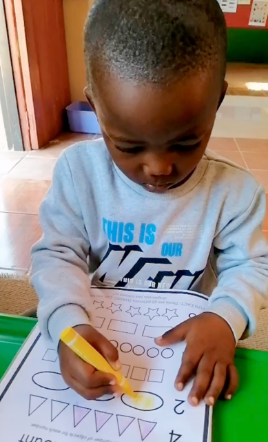 Meet Lihle Wich, colorist extraordinaire at Sophie’s Creche. He is nearly five years old. His name means beauty or greatness. He’s very focused on coloring within the lines of his shapes and getting the numbers correct.